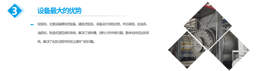 公司生產(chǎn)的設(shè)備的優(yōu)勢:安裝快,全套設(shè)備模塊式裝備,撬裝式組裝,設(shè)備設(shè)計流程合理,外形美觀,出油多,油質(zhì)好。軌道式液壓進料系統(tǒng),解決了進料慢,進料少的傳統(tǒng)問題。整體封閉式出灰系統(tǒng),解決了出灰過程中的灰塵滿天飛的問題。